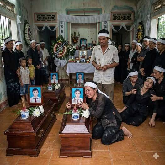 Long nghiêng đầu nghịch ngợm. Duy trầm tư, ánh mắt sâu thẳm. Lan, cô bé nhỏ nhất, tươi rói với đôi mắt trong như suối. Nhưng trước những di ảnh ấy, không ai còn cười nổi. Mẹ Minh quỳ trước quan tài, tay ôm thành hòm, lay gọi: “Con mở mắt nhìn mẹ một lần thôi, Minh ơi!” Bố Long ngồi thất thần, mắt đỏ ngầu, tay run cầm nén nhang không dám châm. Bà Mai, mẹ của Duy và Lan, ngất lên ngất xuống, mỗi lần tỉnh lại chỉ biết gào: “Duy ơi, sao không giữ em cẩn thận? Lan ơi, sao không nghe mẹ ở nhà? Trời ơi, sao cướp cả hai đứa con của tôi?” Cả làng đến viếng, nước mắt lặng lẽ rơi.