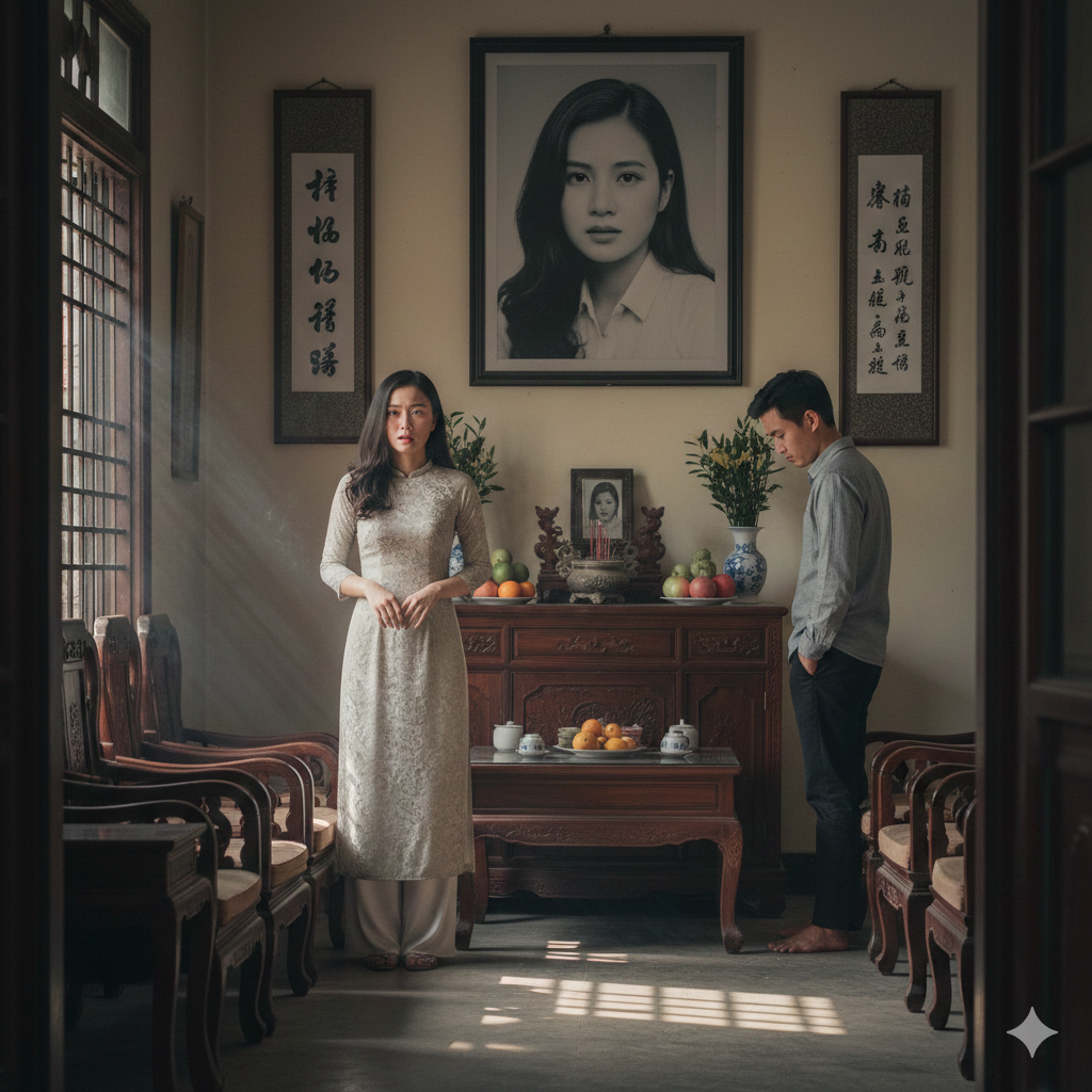 Căn nhà cấp bốn nằm cuối con hẻm nhỏ ở Gò Vấp không có gì đặc biệt: tường vàng đã bong tróc, bộ salon gỗ chạm hoa văn cũ kỹ, mùi nhang thoang thoảng trong không khí. Nhưng chính giữa phòng khách, trên bức tường đối diện cửa ra vào, là một di ảnh.